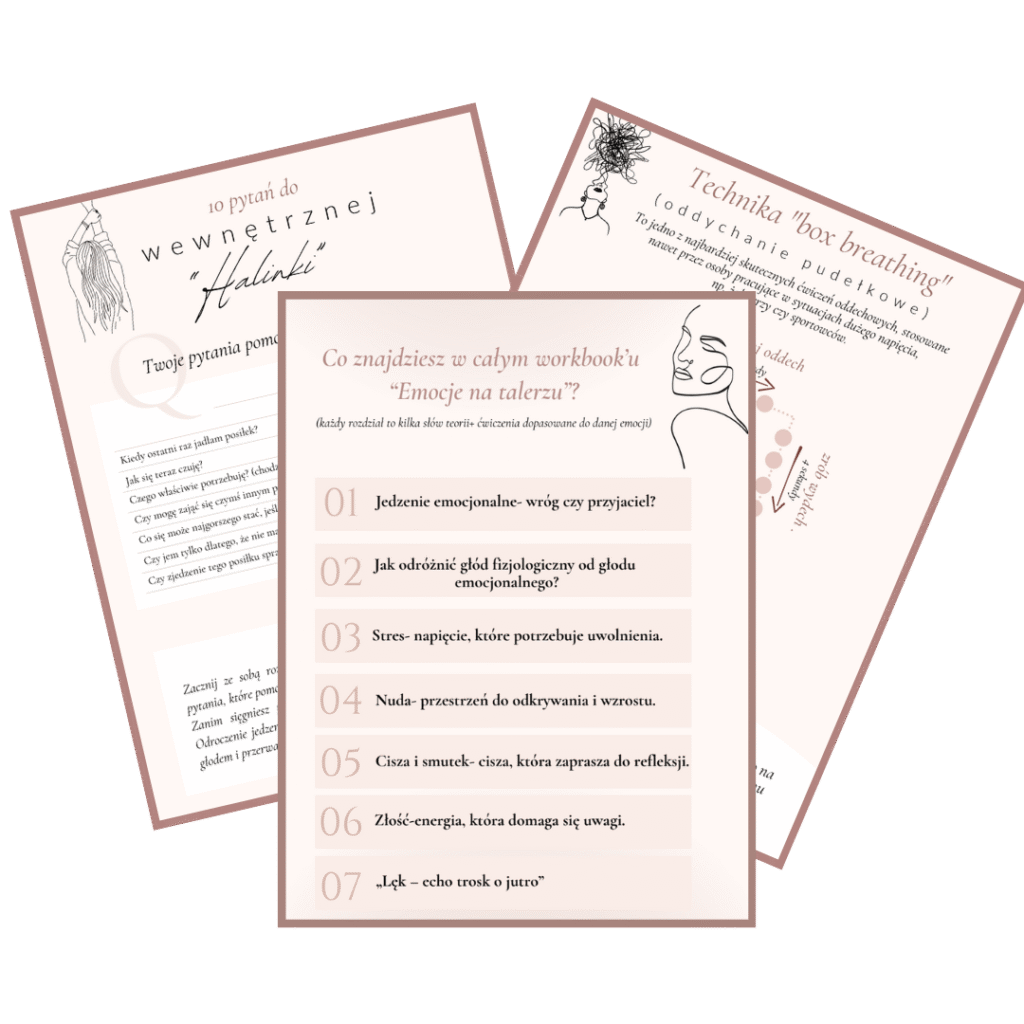 Workbook liczy ponad 70 stron - to pełny zestaw ćwiczeń, zadań i refleksji, które pomagają Ci naprawdę ogarnąć emocje i jedzenie, a nie tylko "poczytać i zapomnieć".